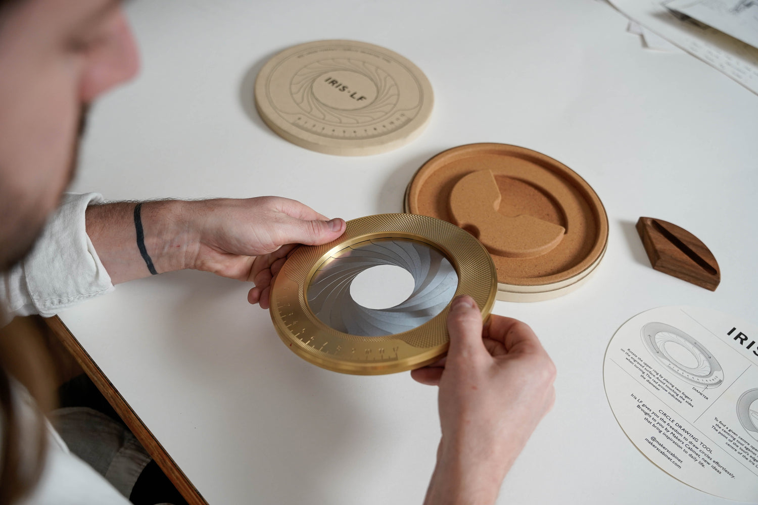 Iris LF gives you the freedom to draw circles effortlessly. Iris LF is the new and improved Iris scaled up to draw 120mm circles. Enjoy drawing single, concentric, or even shaded circles with its unique moving aperture. The walnut centring tool allows you to position your circle to a given point or can be used as a stand to display your Iris.
