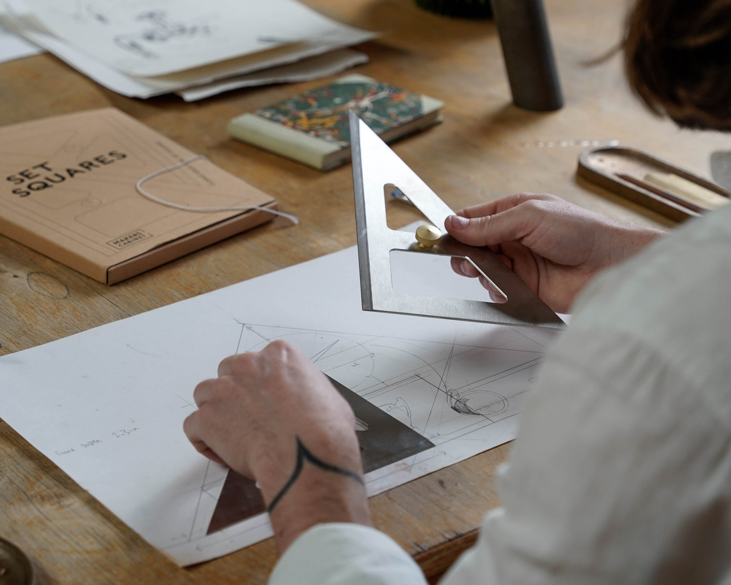 One edge on each is bevelled allowing you to use it as an accurate guide for sketching and cutting. The Set Squares have been precision milled from 2mm thick stainless steel and have screwed-in knurled brass knobs.